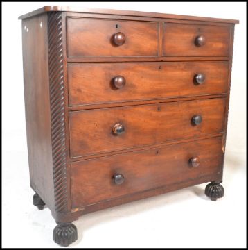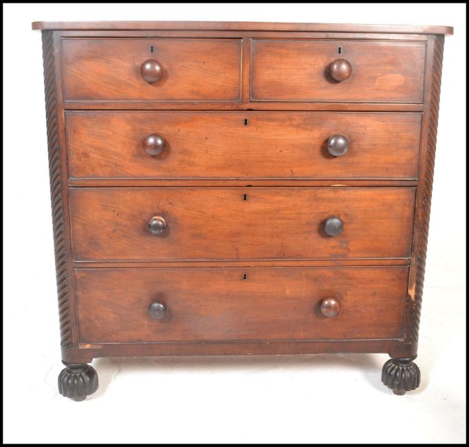 A 19th Century Victorian mahogany two over three chest of drawers, the drawers fitted with turned knob handles flanked by reeded balustrades, raised on turned feet. Measures 117cm high x 121cm wide x 55cm depth.