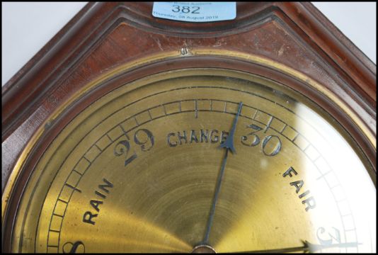 A 20th Century wall barometer of hexagonal form having around brass dial within a mahogany case.
