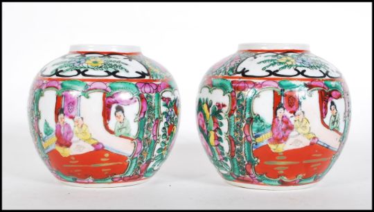 A matching pair of 20th Century Chinese ginger jars being of ovoid form hand decorated with floral patterns depicting oriental scenes having gilt detailing throughout. Four red character marks to base. Measures 10cm tall by 11cm diameter.