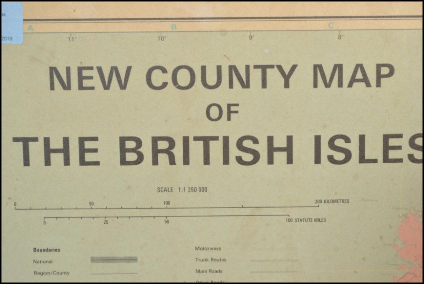 A large vintage mid 20th Century school map of The New Counties Of The British Isles set to board. Measures: 91cm high x 73cm wide.