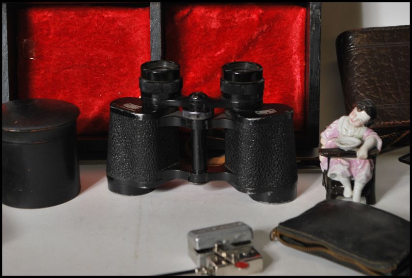 A collection of vintage items to include a pair of Carl Zeiss Jena 8 x 30 binoculars, hip flask, a folding Agfa cased camera, ebony slide rule, a pair of faux tortoiseshell folding Lorgnette glasses, German Haka Autoknips camera timer etc.