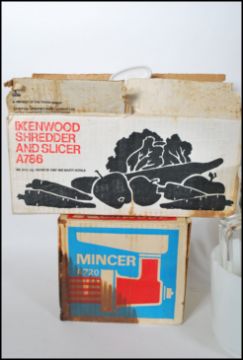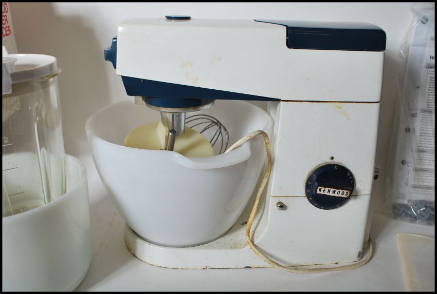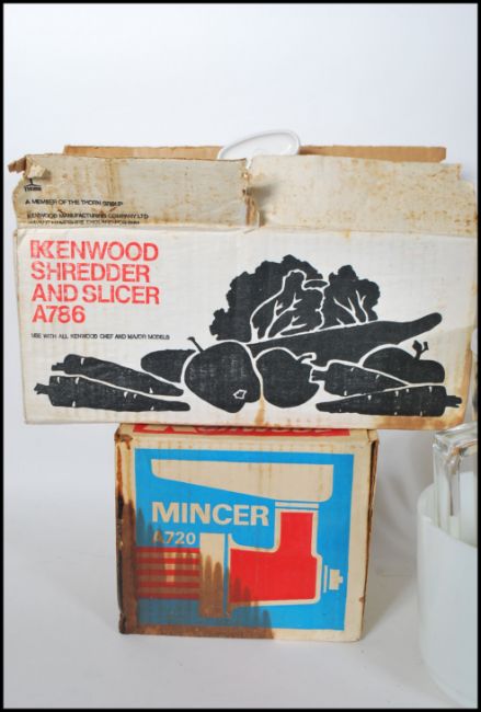 A mid century Kenwood Chef kitchen mixer complete with the K whisk along with other Kenwood accessories etc and a boxed vintage mincer etc.