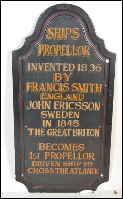 A 20th Century fibreglass made advertising sign, notation to sign reading Ship's Propellor, Invented 1836 By Francis Smith England, John Ericsson In 1845. ' The Great Britain ' Becomes The First Propellor Ship To Cross The Atlantic.