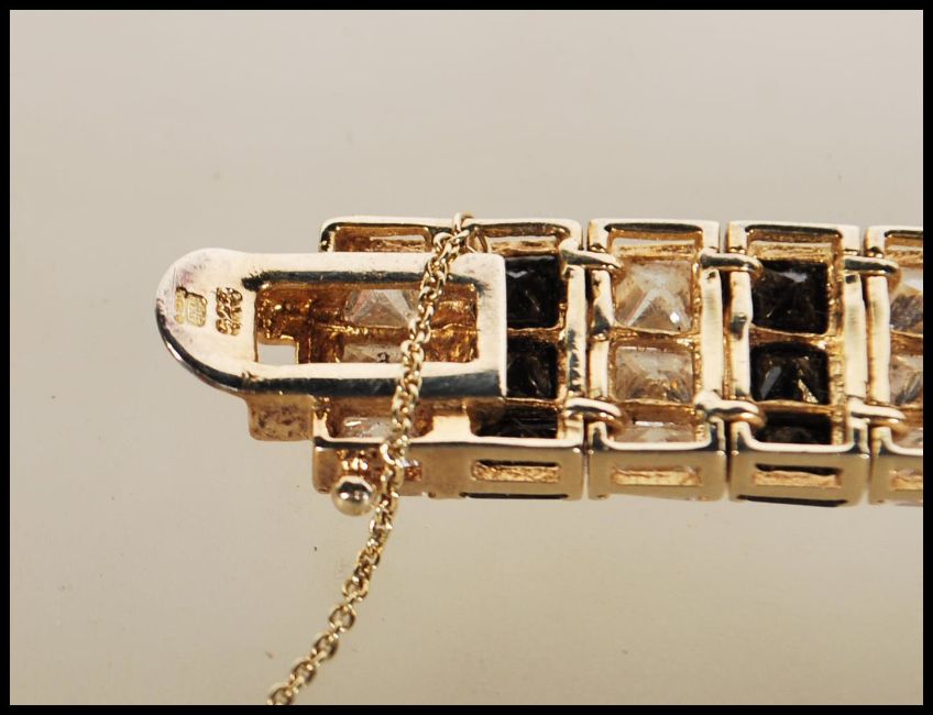 A stamped 925 gilt silver bracelet set with alternate rows of blue and white stones, having a tongue in groove clasp and safety chain. Total weight 43.3g. Measures 8 inches.