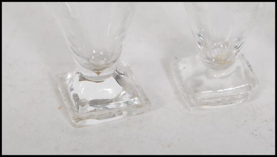 A set of five 19th Century hand blown liqueur / toddy glasses set on a square base raised on a knopped stem with trumpet bowl together with a single shipping line glass etched with FB