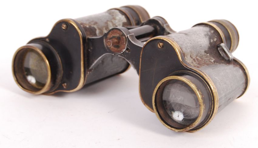 A pair of WWI First World War German C.P. Goerz M9 field binoculars No. 30053 Mit Skala M.9. Feldstecher 6 Fach. Lenses clear, one having yellow tint and other having crosshair.