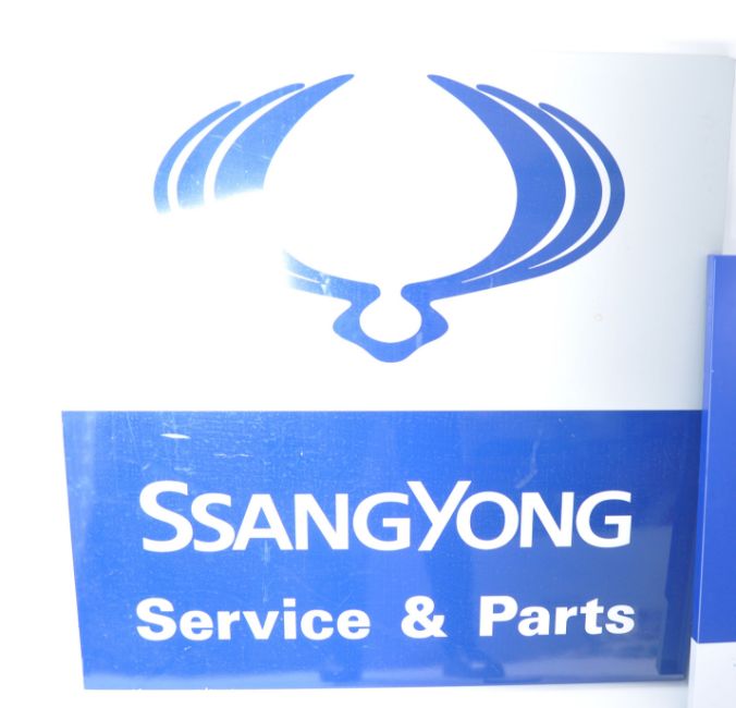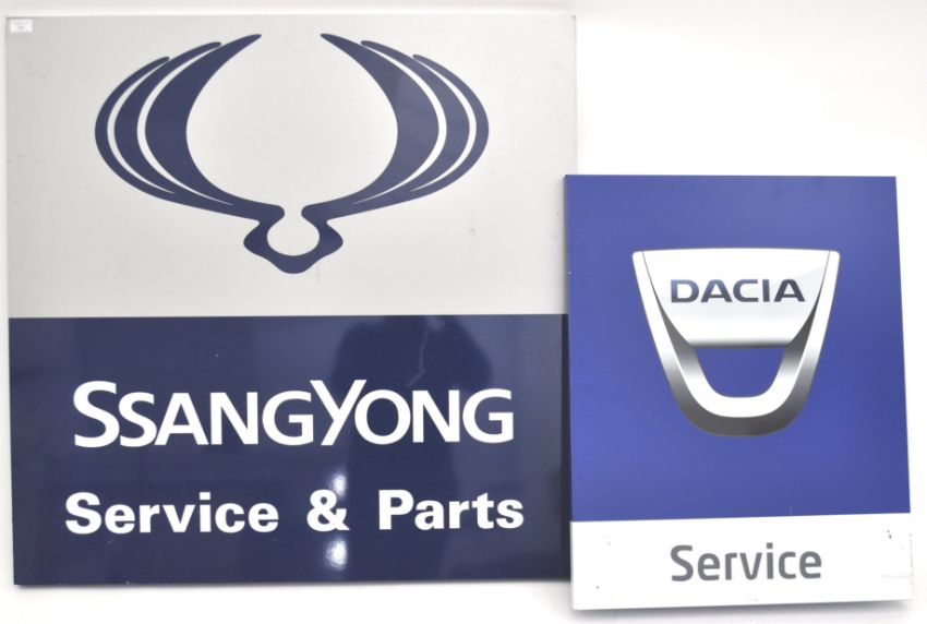 Ssangyong - Dacia - Two late 20th Century contemporary retro car motoring point of sale showroom advertising light box plastic sign fronts reading 'Ssangyong Service & Parts' amd Dacia Service. Largest measures 100cm x 100cm.