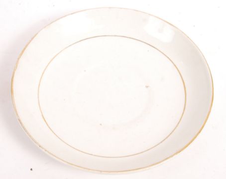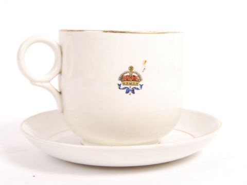 An early 20th century WWI First World War large oversized ' Good Luck To The Allies ' teacup and saucer. Gilded decoration with central image depicting the four flags of the Allies with notation reading ' For Right and Freedom. Believed Sunderland factory. Measures: 11cm.