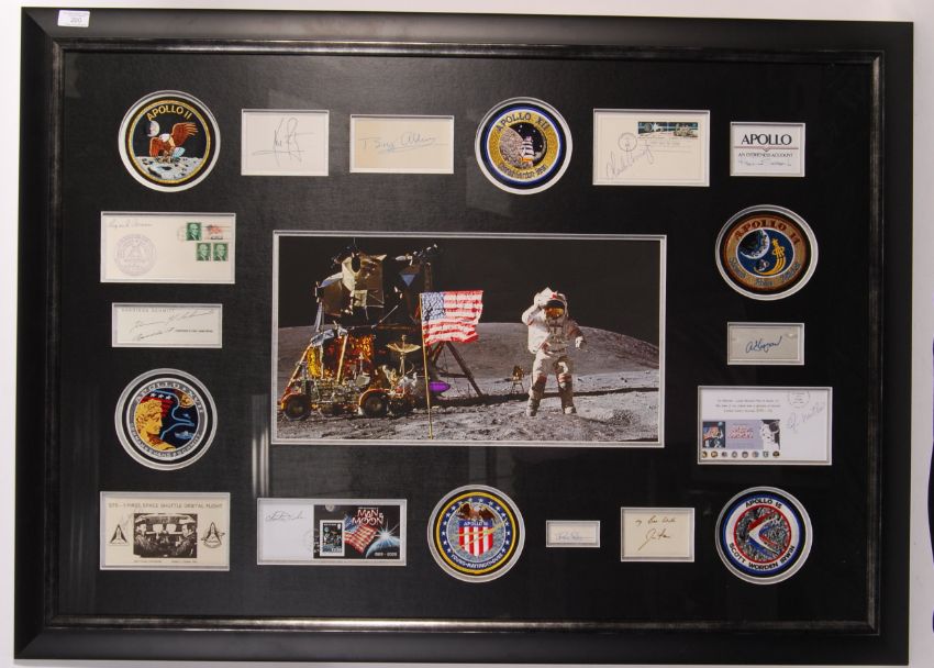 A stunning and unique Apollo Moonwalkers autograph presentation. The matted display featuring signed pieces from all twelve Apollo Moon Walker astronauts, including; Neil Armstrong (1930-2012), Buzz Aldrin, Pete Conrad (1930-1999), Alan Bean (1932-2018), Alan Shepard (1923-1998), Edgar Mitchell (1930-2016), David Scott, John Young (1930-2018), James Irwin (1930-1991), Charles Duke, Eugene Ceman (1934-2017), and Harrison Schmitt. The autographs either being on paper, covers or cards, come framed with a large central photograph and various replica NASA / Apollo mission patches. Professionally framed and glazed to a total size of: 83cm x 114cm. Certificated by Charles Phillips & Sons. A rare and impressive collection of autographs, made more poignant by the 50th anniversary this year of the Apollo 11 Moon Landings.