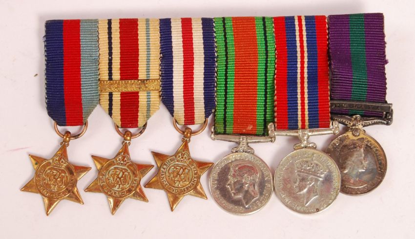 A post WWII Second World War James Beever & Co Ltd Huddersfield British Bandsman military dress tunic to include a miniature medal group comprising of; France And Germany Star, Africa Star, 39-45 Star, Defence Medal, War Medal and Imperial Service Medal.
