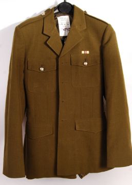 A collection of x3 assorted military and related uniforms. Comprising: a contemporary military dress jacket (with medal ribbon), a 20th century greatcoat (possibly Fire Brigade) and a ' 1st Oldland Girls Brigade ' uniform with skirt. Great collection.