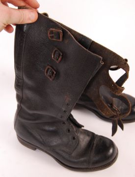 A pair of WWII Second World War 1941 issue black military Despatch Rider's motorcycle boots. Size 6. Quality leather construction. One buckle missing. Rare.