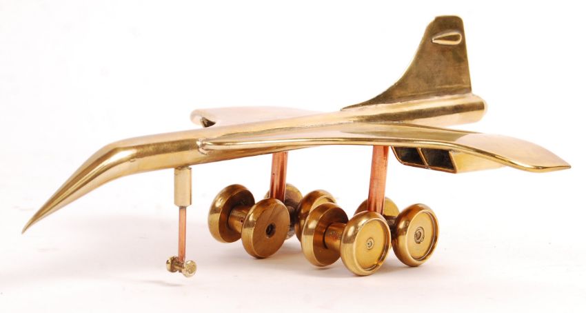 A 20th century cast heavy brass trench art style model of The Concorde plane having shaped nose removable landing gear base. Measures 24cm long.