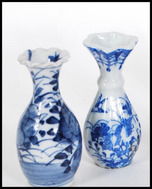 A group of 20th Century blue and white miniature oriental Chinese and Japanese vases of various shapes and sizes, double gourd, tapering examples etc. Most having swirl and foliate decoration with some having oriental scenes.