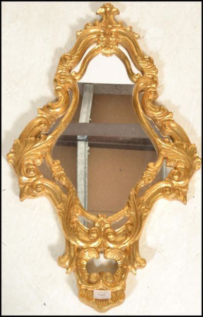 A 20th Century gilt rococo style wall mirror having a symmetrical reeded gilt frame with scrolled leaf pierced decoration to the top and sides. Measures 82cm high x 48cm wide.