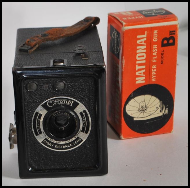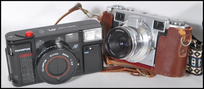 A collection of vintage film cameras to include a Praktica B100 film camera, an Olympus Quick Flash AFL, a folding Kodak Junior II Camera, a Coronet box camera, a Zeiss Ikon baby box camera, an Olympus Trip 35 and a Leidolf Wetzlar Lordonar camera.