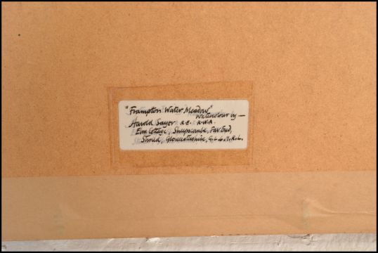 Harold Sayer R.E. R.W.A. (1913-1993) - 'Frampton Water Meadow' A 20th Century watercolour on paper painting depicting a landscape scene depicting a meadow with a village to the background with a church standing above trees. Signed, framed and glazed. 58cms x 74cm.
