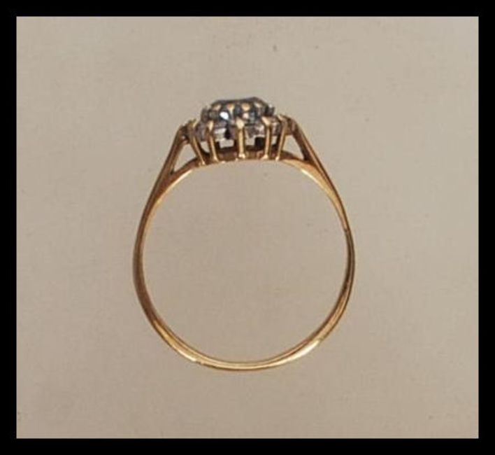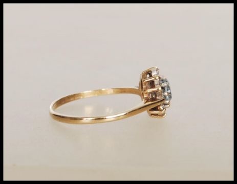 An English hallmarked 9ct gold ring set with a heart cut blue stone with a halo of white accent stones. Assay marked Birmingham. Weight 1.5g. Size M.5.