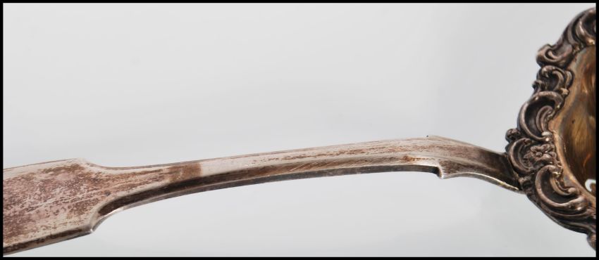 A large 19th century Imperial Russian 84 Zolotnic silver sugar sifter spoon / ladle. The ladle having a large vermeil lined bowl with pierced swirls rising to a rococo style border of swirls and foliates raised in relief to a fiddle style handle with monogram. Assay mark to verso of handle for Eduvard Eduard Fyodorovich Brandenburg 1863. Measures 7 inches. Weight 52g.