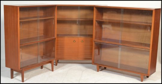 A set of three retro 20th Century teak wood glazed bookcases, each bookcase having sliding glass doors with adjustable shelves raised on tapering supports.
