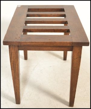 A Victorian 19th century Arts & Crafts oak coaching stand / luggage table. Raised on squared legs with a fitted frieze having a planked top above.