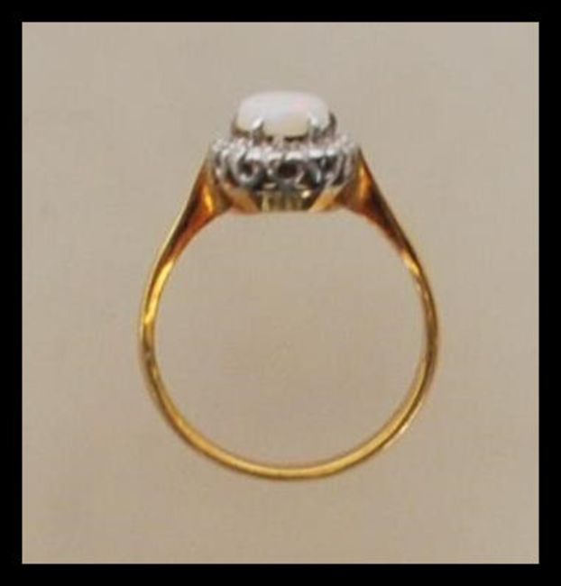 A stamped 18ct gold ladies ring set with an oval opal cabochon having a halo of white stones. Weight 3.6g. Size P.
