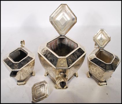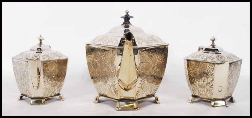 A good quality early 20th Century Walker & Hall silver plate tea service of octagonal form consisting of tea pot, sugar pot and creamer / milk jug. Each piece having engraved floral decorated panels raised on stepped canted feet with finialled hinged lids. The tea pot having a blue stained wooden handle. Marks to bases for Walker and Hall. Tea pot measures 15cm tall by 30cm wide.