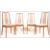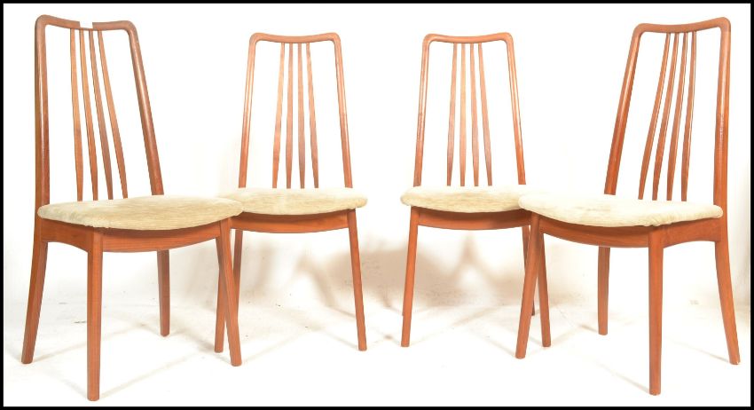 A set of four vintage retro mid 20th Century Danish dining chairs having teak wood frames raised on square legs with four rail back supports to the backrest and cream upholstered seat pads. Measures 100 cm high x 46 cm wide x 55 cm deep.
