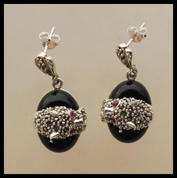 A pair of Cartier style silver and onyx drop earrings in the form of panthers having marcasite dealing set with ruby eyes. Stamped 925. Gross weight 13g. Measure 3cm long.