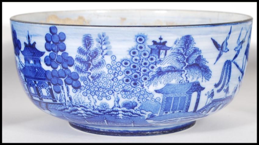 A set of five early 20th Century graduating blue and white Willow pattern serving bowls by Mintons. Marks to each base. Smallest bowl measures 7cm tall by 15cm diameter with the biggest measures 10cm tall by 22cm diameter.