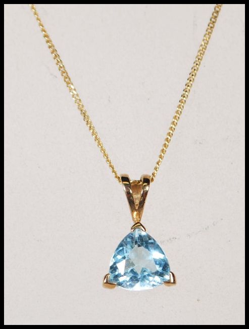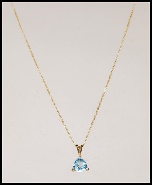 A 9ct gold fine lined ladies necklace chain set with a 9ct gold blue quartz pendant drop. Measures 42cms long / weight 1.80g