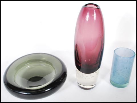 Scandinavian  glass - A group of three pieces of 1960's / 70's retro vintage studio glass to include a Danish Holmegaard asymmetric smokey glass bowl by Per Lutken (signed and dated 1962), a Finnish Riihimäen Lasi purple glass torpedo vase having bubbles to the base by Aimo Okkolin (signed to the base) and a possibly Norwegian cased blue glass vase of cylindrical form having control bubbles. Measures: 23cm tall.