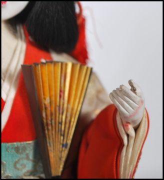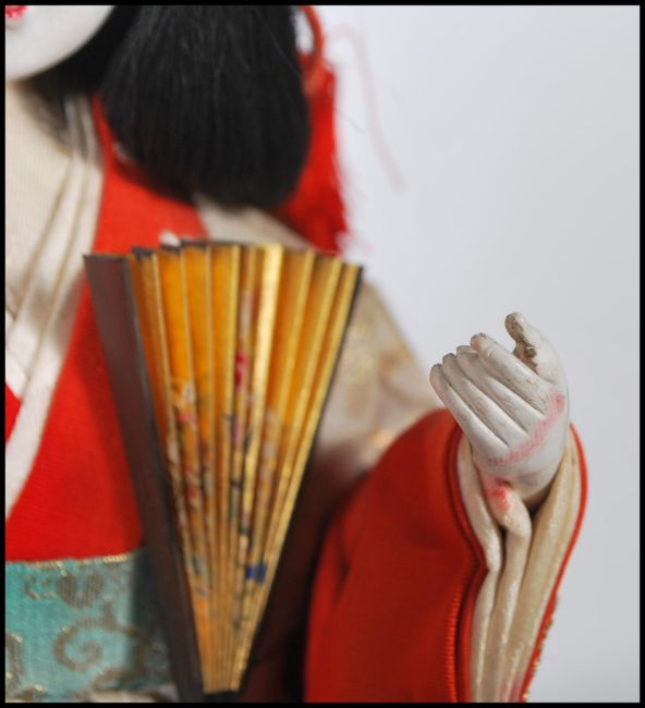 A pair of 20th Century Chinese ornamental dolls depicting two women in traditional dress, having ceramic features with hand painted details wearing heavily embroidered kimono sleeve robes, raised on square plinth bases.