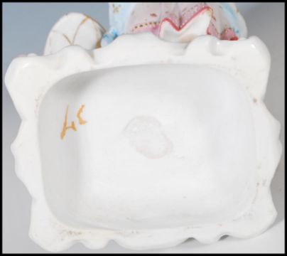 A collection of 20th Century German ceramic figurines to include two Sitzendorf figure groups depicting characters with oak trees raised on scrolled bases, a KLM cherub figure group and three bisque figures with gilt detailing.