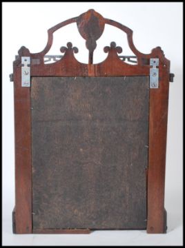 An early 20th Century wall mounted display cabinet being mahogany cased with pierced fretwork to the shelf and frieze with a symmetrical pediment to the top, with a mirror back flanked by four turned columns. Measures 45 cm high x 33 cm wide x 17 cm deep.