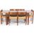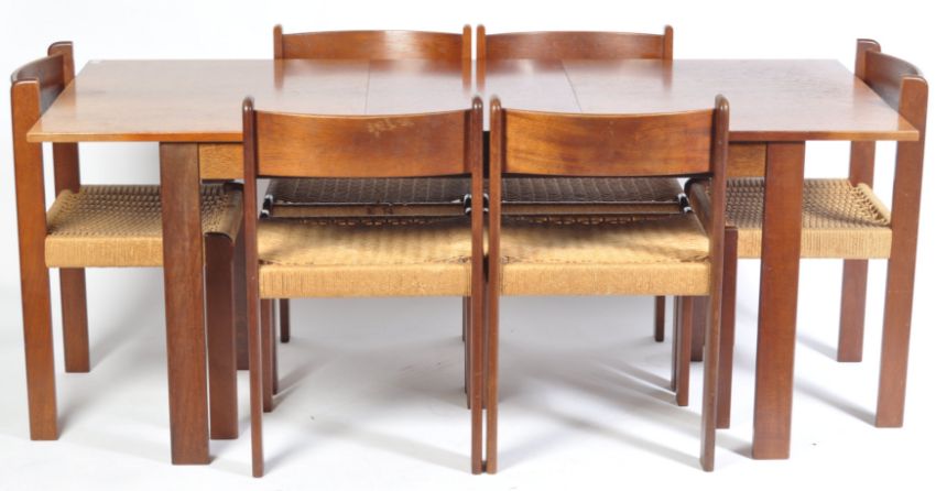 A mid 20th century 1960's Danish retro vintage designer teak wood and paper cord dining suite comprising of a set of six dining chairs having paper cord seats curved panel backrest raised on flat rectangular legs along with a matching teak wood extending dining table with leaf. Measures;