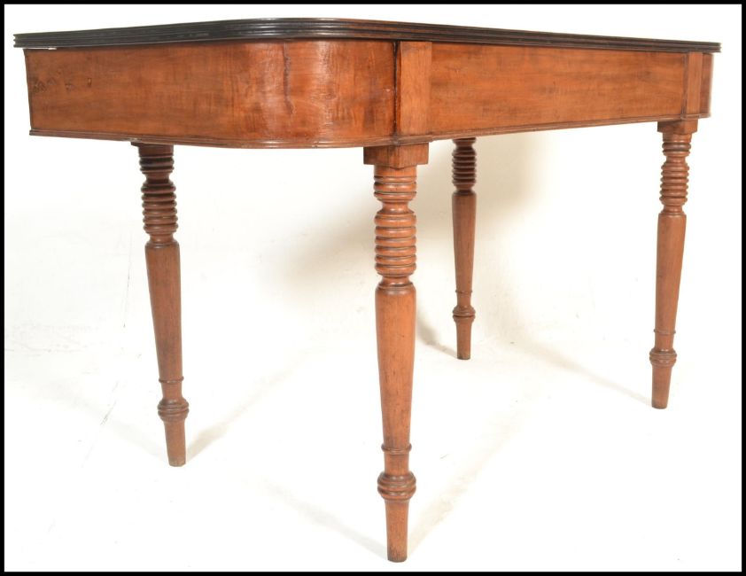 A Georgian 19th Century mahogany console hall table being raised on turned tapering legs with fitted frieze and flared top above. Measures 74cm tall by 127cm wide and 58cm deep.