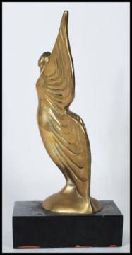 A 20th Century Art Deco style brass figure in the form of a lady wearing a butterfly wings style dress, inspired by The Spirit Of Ecstasy. Raised on a ebony plinth base. Measures 27cm tall by 8cm wide 13cm deep.