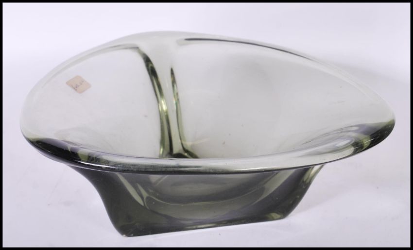 A group of three mid 20th Century vintage retro studio glass to include a Zelezny Brod Sklo style triangular shaped smokey glass bowl together with an olive green cased glass vase of bulbous form and a grey smoked glass vase of tapering form.