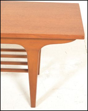 A mid century Danish influence teak wood long john coffee table being raised on tapering legs with a rectangular top with railed lower tier magazine rack.