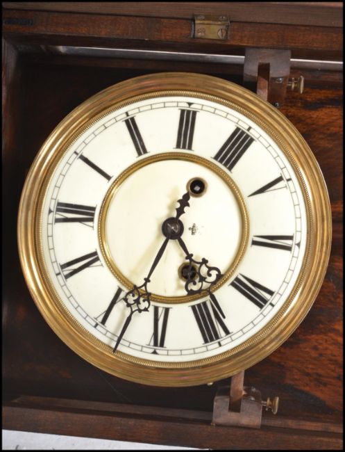 A 19th Century Vienna wall clock set within a mahogany case with glazed panel door flanked by turned knopped columns with a round white enamelled face to the top with pierced decoration hands and Roman numerals to the chapter ring. Measures 93 cm x 50 cm.
