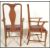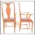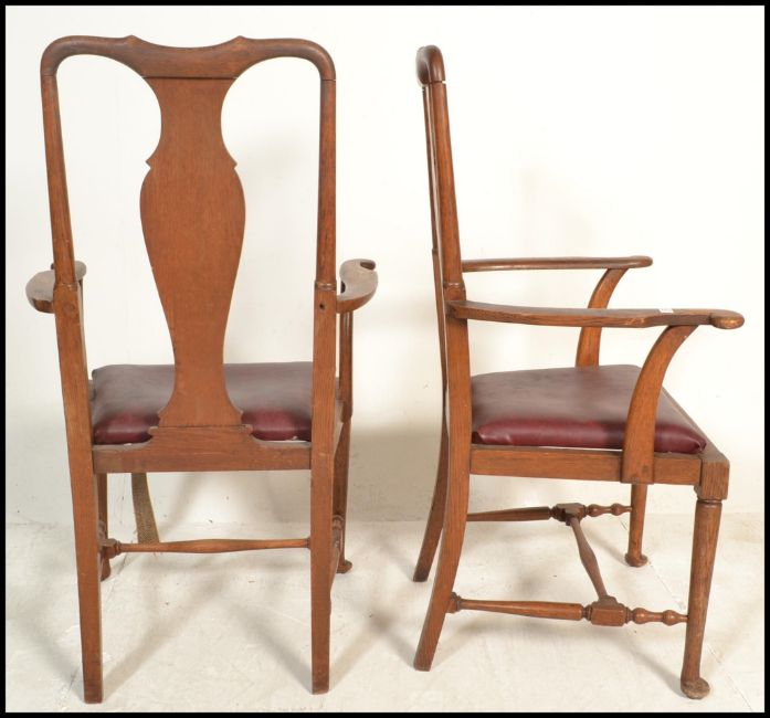 A pair of Edwardian oak Queen Anne elbow dining chairs being raised on cabriole legs with pad feet united by stretchers, drop in seat pads. High Queen Anne splat back rests. Measures 112 cm high x 67 cm wide x 60 cm deep.