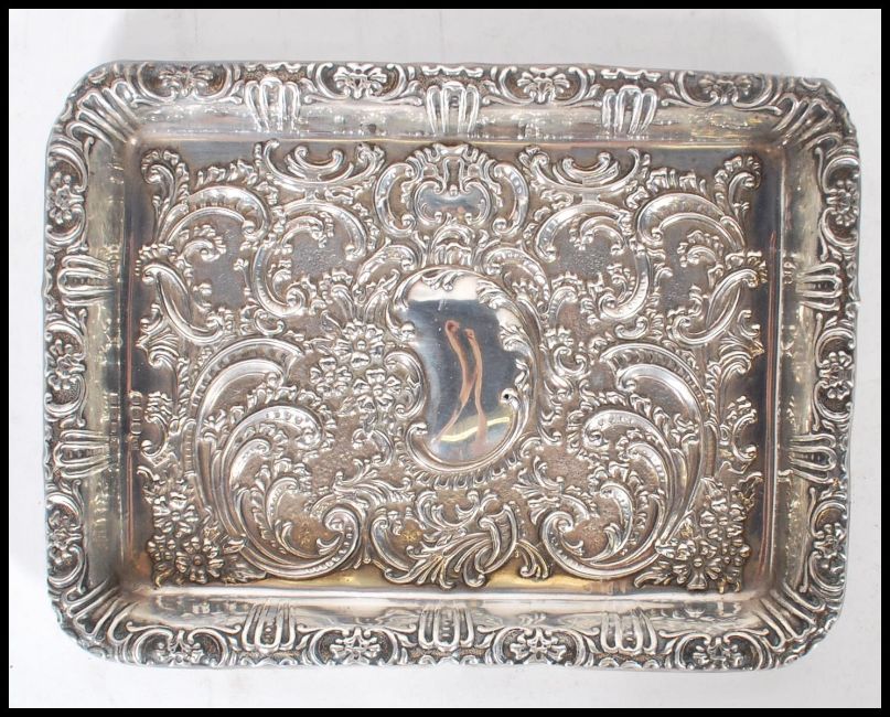 A George Lingard silver hallmarked dressing table tray of rectangular form having scrolled repousse decoration with an unmarked panel to the centre. Hallmarked Birmingham 1901. Weight 195g. Measures 26 x 19cm.