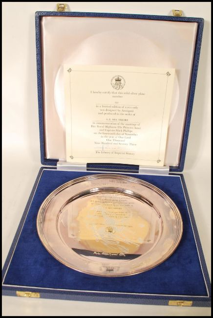 A cased limited edition (557/2000) silver London hallmarked plate commemorating the marriage of Princess Anne & Capt Phillips, designed by Annigoni, 12 troy ozs, London 1973, in original case and with certificate