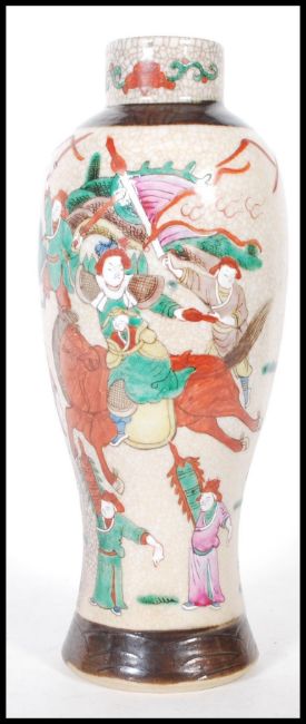 A 20th Century Chinese vase of tapering waisted form having a cream crackle glaze with hand painted warriors and horses, having dark brown engraved borders, character mark to base. Small crack to the side present.  Measures 30 cm high.