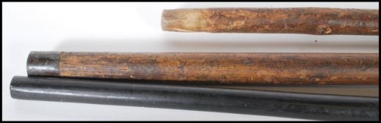 A group of three 20th Century walking stick canes to include a 19th Century Victorian stick with a horn handle a silver hallmarked collar with repousse decoration (hallmarked Birmingham 1892), a hawthorne stick with a crook handle and an ebonised stick with carved geometric decoration.