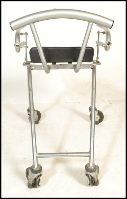 An unusual industrial style bespoke made wheeled chair constructed from a tubular metal frame having arms made from reconstituted bike frames with supports made from spanners, raised on splayed legs terminating in large castors, the seat upholstered in black leather. Measures 94 cm high x 60 cm wide x 50 cm deep.