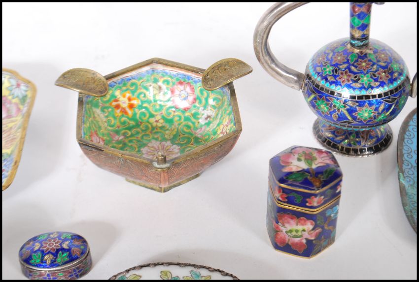 A collection of 20th Century enamel wares to include two Chinese Cloisonne dishes one decorated with a peony and the other a warrior, an enamelled ashtray of hexagonal form, a trinket dish enamelled with peonies and fruits, a selection of pill boxes, a white metal bound mirror decorated with floral sprays etc.