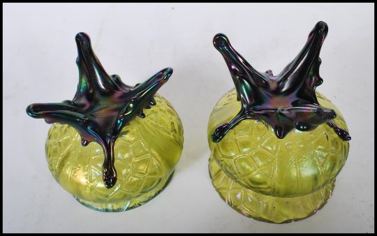 A pair of early 20th Century pressed green glass vases of bulbous forms raised on tripod iridescent tripod feet. Measures: 10cm tall x 10cm diameter.
