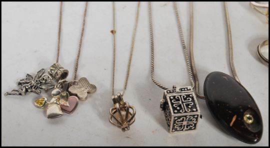 A group of mostly silver jewellery to include two silver bangles one having a mother of pearl heart shaped pendant and a 9ct gold plate bangle, silver weir necklace and multiple silver chain necklace and pendants, silver charm bracelet, silver earnings and rings etc. Gross weight 243g.